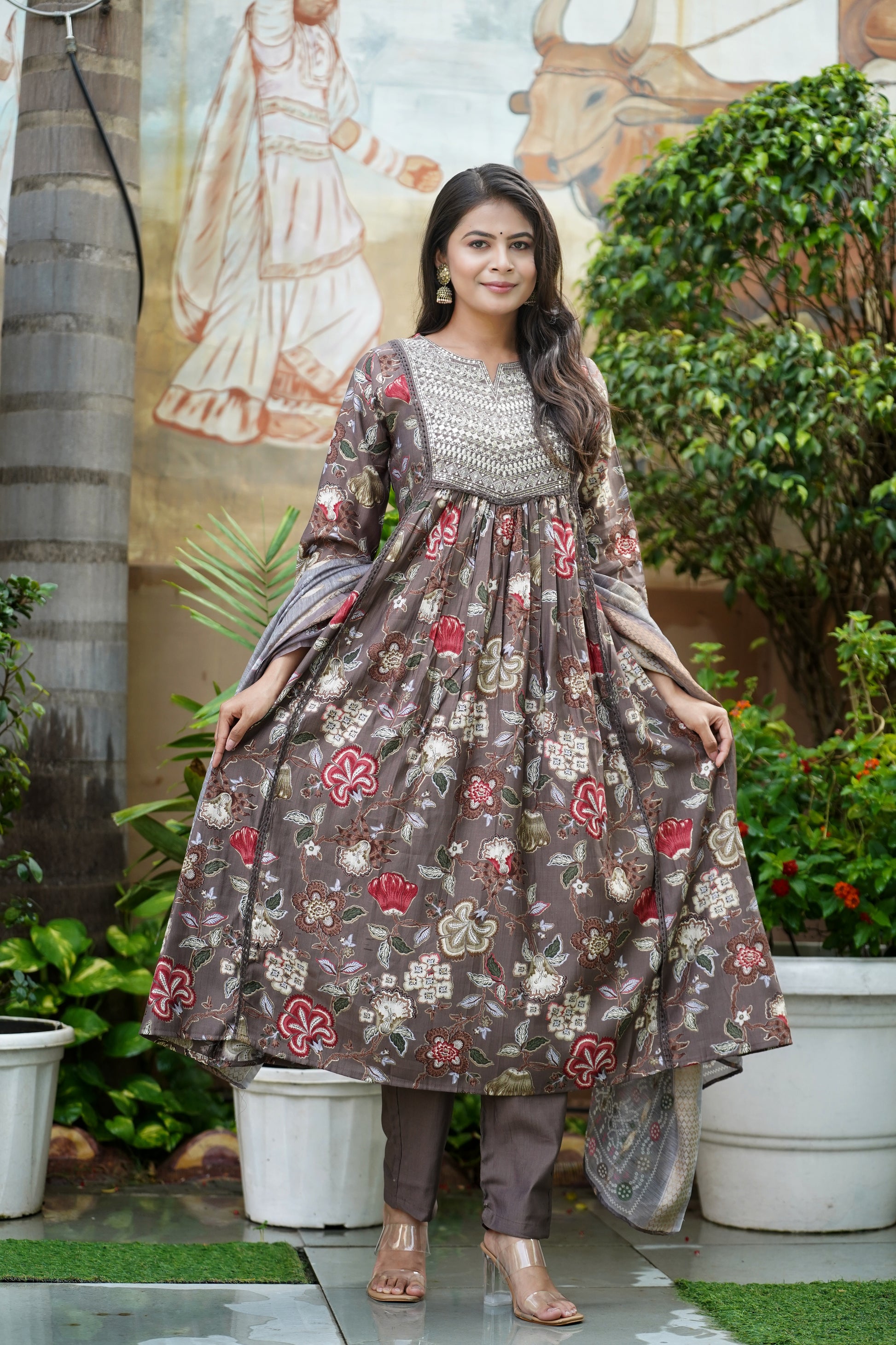Shagun Creations Brown Embroidered Verticle A-line Suit Set